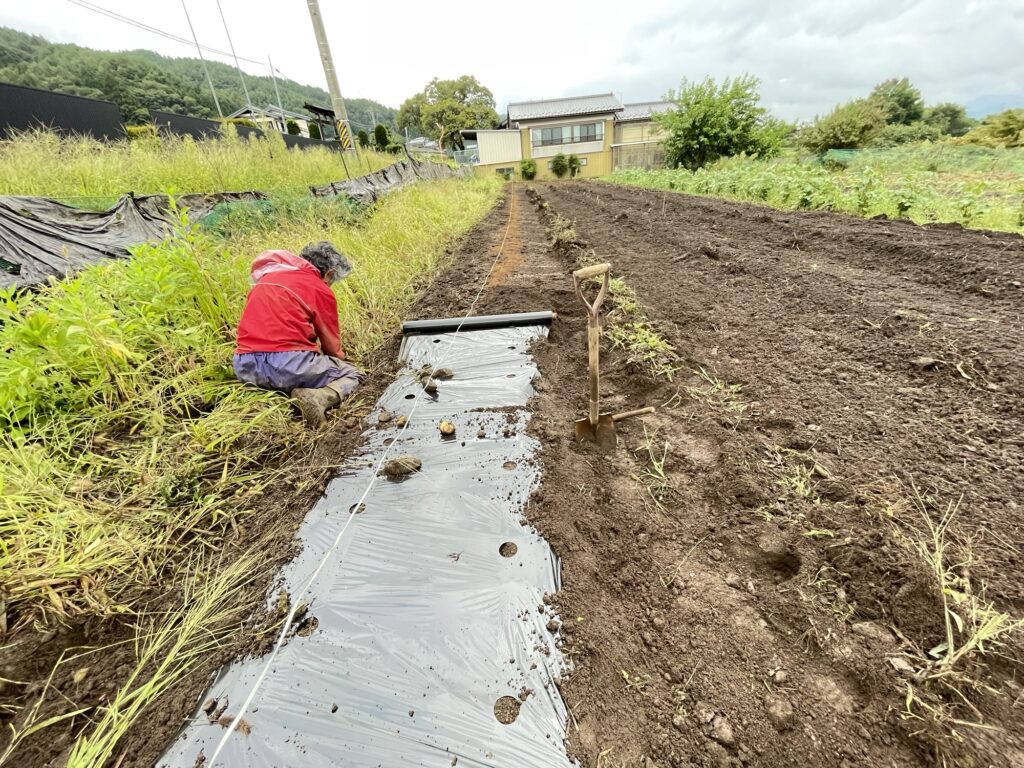 この畑の規模で、手作業でマルチ敷いているのうちだけやねんてー